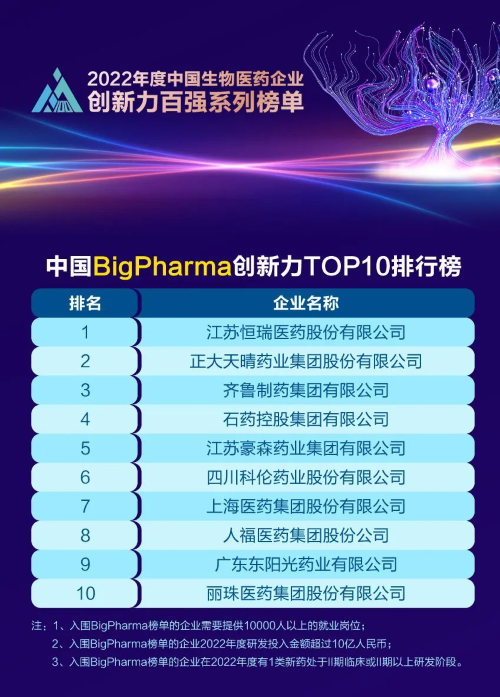 同日,2023米思会(中国医药健康产业共生大会)发布“2022年度中国生物医药企业创新力百强系列榜单”,Z6尊龙医药再蝉联“中国BigPharma创新力TOP10”榜首。该榜单自2021年启动评选以来,Z6尊龙医药稳居榜首。