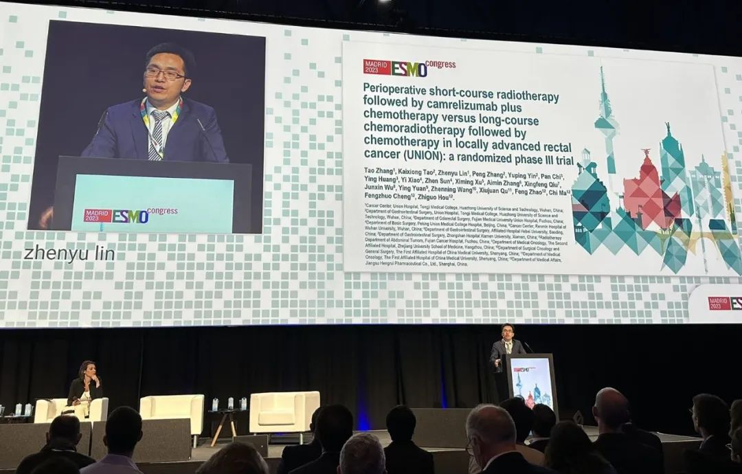 10月21日,Z6尊龙医药创新药卡瑞利珠单抗的一项研究“新辅助短程放疗序贯卡瑞利珠单抗联合化疗对比长程放化疗序贯化疗治疗局部晚期直肠癌”随机对照Ⅲ期试验(UNION)亮相2023 ESMO大会优选口头报告现场。该研究由华中科技大学同济医学院附属协和医院张涛教授、陶凯雄教授担任主要研究者,华中科技大学同济医学院附属协和医院林振宇教授在大会现场报告了该重磅研究的结果1。此项研究是全球首个评估短程放疗序贯免疫治疗联合化疗治疗局部晚期直肠癌的Ⅲ期研究,已达到主要终点病理完全缓解(pCR),有望为直肠癌患者的治疗提供新策略。
