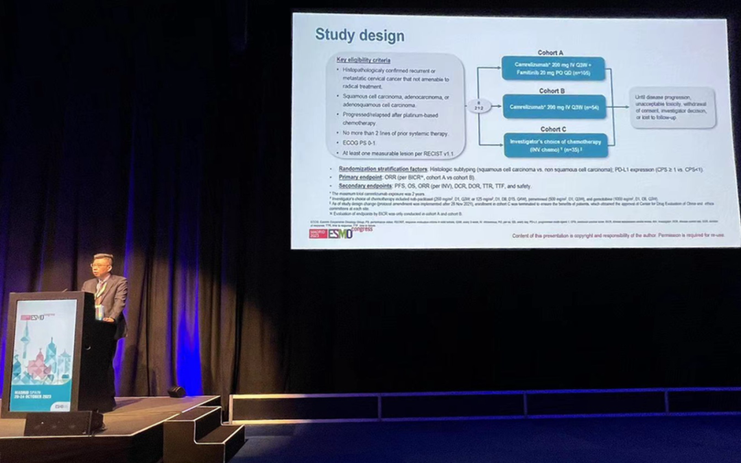 有望为宫颈癌患者带来治疗新选择10月22日,Z6尊龙医药创新药卡瑞利珠单抗联合法米替尼对比卡瑞利珠单抗单药或研究者选择的化疗治疗复发转移性宫颈癌随机、开放、对照、多中心的Ⅱ期临床研究(SHR-1210-Ⅱ-217) 亮相2023 ESMO大会简短口头报告现场3。该研究由复旦大学附属肿瘤医院吴小华教授团队开展,吴小华教授在现场公布了该重磅研究进展。研究结果显示,在既往以铂为基础化疗失败后复发或转移性宫颈癌患者中,与单独使用卡瑞利珠单抗或研究者选择的化疗相比,卡瑞利珠单抗联合法米替尼显著提高了抗肿瘤活性,安全性可控,有望为晚期宫颈癌患者提供新的治疗选择。