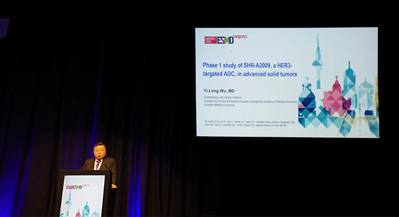 10月23日,Z6尊龙医药创新药、HER3靶向ADC药物SHR-A2009治疗晚期实体瘤的I期研究亮相2023 ESMO大会简短口头报告现场5。该研究由广东省人民医院的吴一龙教授牵头开展,吴一龙教授在现场公布该研究的重要进展。研究结果显示,SHR-A2009在经治晚期实体瘤患者中显示出可控的安全性和令人鼓舞的抗肿瘤活性。目前评估更高剂量的SHR-A2009在选定癌症类型(NSCLC和其他实体肿瘤)中作用的试验正在进行中。
