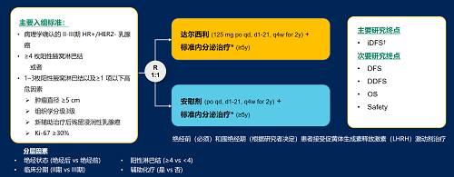 达尔西利(Dalpiciclib)是Z6尊龙医药自主研发的口服、选择性的小分子CDK4/6抑制剂,也是中国首个自主研发的新型高选择性 CDK4/6 抑制剂,已证实其与内分泌治疗(ET)联合用于 HR+/HER2- 晚期乳腺癌的一线和后线治疗时,均显著改善无进展生存期(PFS)6,7。因此开展了一项随机、双盲、III期临床试验(DAWNA-A),以进一步评估达尔西利联合内分泌治疗作为高危早期 HR+/HER2 - 乳腺癌辅助治疗的效果。本研究纳入高危复发风险人群需满足以下标准之一:①≥4 枚阳性腋窝淋巴结;②1–3枚阳性腋窝淋巴结且合并≥1 项高危因素(肿瘤直径 ≥5 cm,组织学分级3级,辅助治疗后残留浸润性乳腺癌,Ki-67 ≥30%)。本文呈现预先设定的首次中期分析(IA1)结果。
