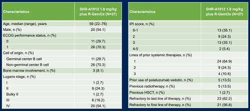 共有37例复发难治DLBCL患者接受了SHR-A1912 1.8 mg/kg联合R-GemOx治疗。其中,62.2%的受试者对上一线治疗难治,56.8%的受试者为原发难治(表1)。