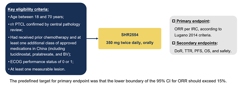 该研究旨在评估泽美妥司他片单药在R/R PTCL患者中的抗肿瘤疗效和安全性。其主要研究终点为由独立影像评审委员会(IRC)基于Lugano 2014标准评估的客观缓解率(ORR),次要研究终点包括无进展生存期(PFS)、缓解持续时间(DoR)、总生存期(OS)等。