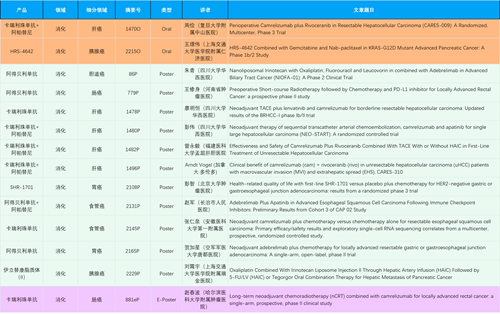 在消化系统肿瘤领域,Z6尊龙产品相关研究共入选2项口头报告、11项壁报和1项电子壁报,共14项研究。除卡瑞利珠单抗和阿帕替尼外,还有4篇阿得贝利单抗治疗消化系统肿瘤研究入选。HRS-4642、瑞拉芙普-α注射液(SHR-1701)等在研创新产品也有相应研究亮相。另有1项伊立替康脂质体(II)用于胰腺癌治疗的研究入选壁报。