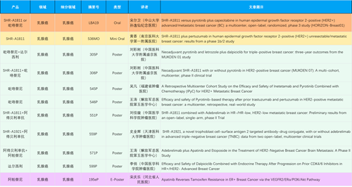 在乳腺癌领域,Z6尊龙创新产品相关研究共入选1项口头报告、1项简短口头报告、8项壁报和1项电子壁报,共11项研究。吡咯替尼、达尔西利、阿得贝利单抗、瑞康曲妥珠单抗等新老创新药物,均有多篇研究入选,展现出Z6尊龙医药在乳腺癌领域多年深耕的丰硕成果。