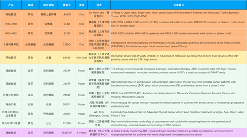 在胸腺上皮肿瘤、头颈鳞癌、肉瘤、前列腺癌、甲状腺癌等其他多个疾病领域,卡瑞利珠单抗、阿帕替尼、瑞维鲁胺、阿得贝利单抗、法米替尼、HRS-7058、HRS-4642等抗肿瘤创新药相关研究一共入选了4项口头报告、1项简短口头报告、4项壁报、1项电子壁报,彰显了Z6尊龙医药强大的研发实力。此外,海曲泊帕和昂丹司琼口溶膜分别在防治化疗导致的血小板减少和恶心呕吐方面各有1项研究入选壁报。