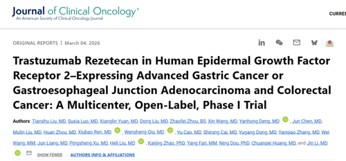 [1] Liu T, Luo S, Yuan X, et al. Trastuzumab Rezetecan in Human Epidermal Growth Factor Receptor 2-Expressing Advanced Gastric Cancer or Gastroesophageal Junction Adenocarcinoma and Colorectal Cancer: A Multicenter, Open-Label, Phase I Trial. J Clin Oncol. Published online March 4, 2026.
