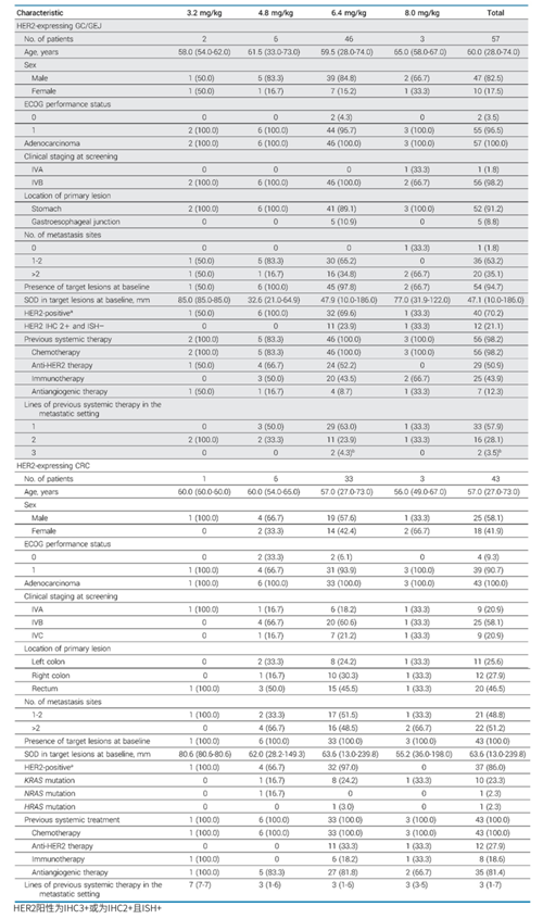 此项Ⅰ期临床试验包括剂量递增、药代动力学扩展和临床扩展三个部分,纳入经标准治疗失败、对标准治疗不耐受或无可用标准治疗且具有HER2表达(IHC 1+,2+或3+或ISH+)的GC/GEJ和CRC患者。