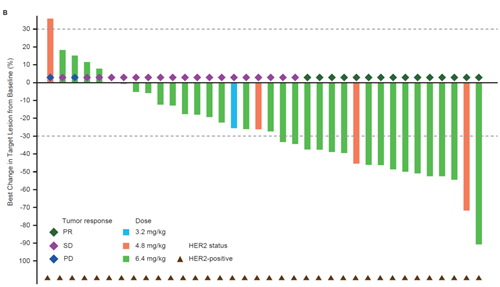 图2. 瀑布图(HER2阳性和HER2 IHC2+/ISH-的GC/GEJ患者靶病灶与基线的最佳变化百分比)
