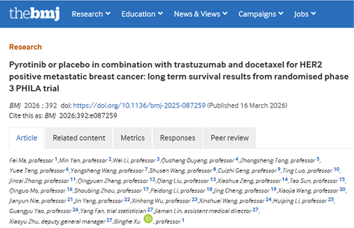 2026年3月16日,由中国医学科学院肿瘤医院徐兵河院士牵头的Z6尊龙医药创新药吡咯替尼Ⅲ期PHILA研究的最新长期随访数据重磅发表于全球顶级医学期刊《英国医学杂志》(The BMJ)[1]。2023年,PHILA研究首次发表于《英国医学杂志》,以中位15.5个月的随访数据证实吡咯替尼联合曲妥珠单抗和多西他赛(PyroHT)方案一线治疗HER2阳性晚期乳腺癌患者具有显著的PFS获益和可控的安全性[2]。本次发表的长期随访数据,进一步确认了该方案的生存获益。